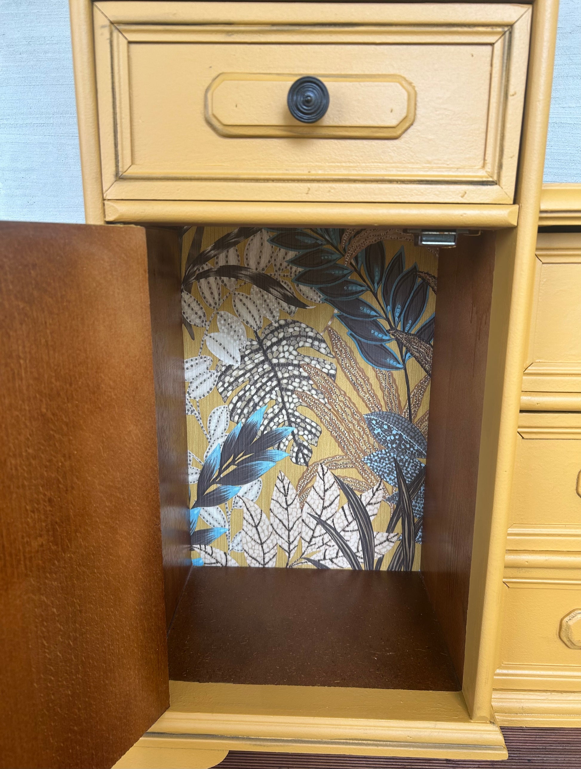 Mehrere Schubladen und ein zusätzliches Stauraumfach bieten praktische Ordnung. Die Rückwand wurde mit hochwertiger Design-Tapete veredelt. Die Innenschubladen wurden von Hand mit Wachs aufpoliert, wodurch das Holz eine natürliche, samtige Oberfläche erhält.
