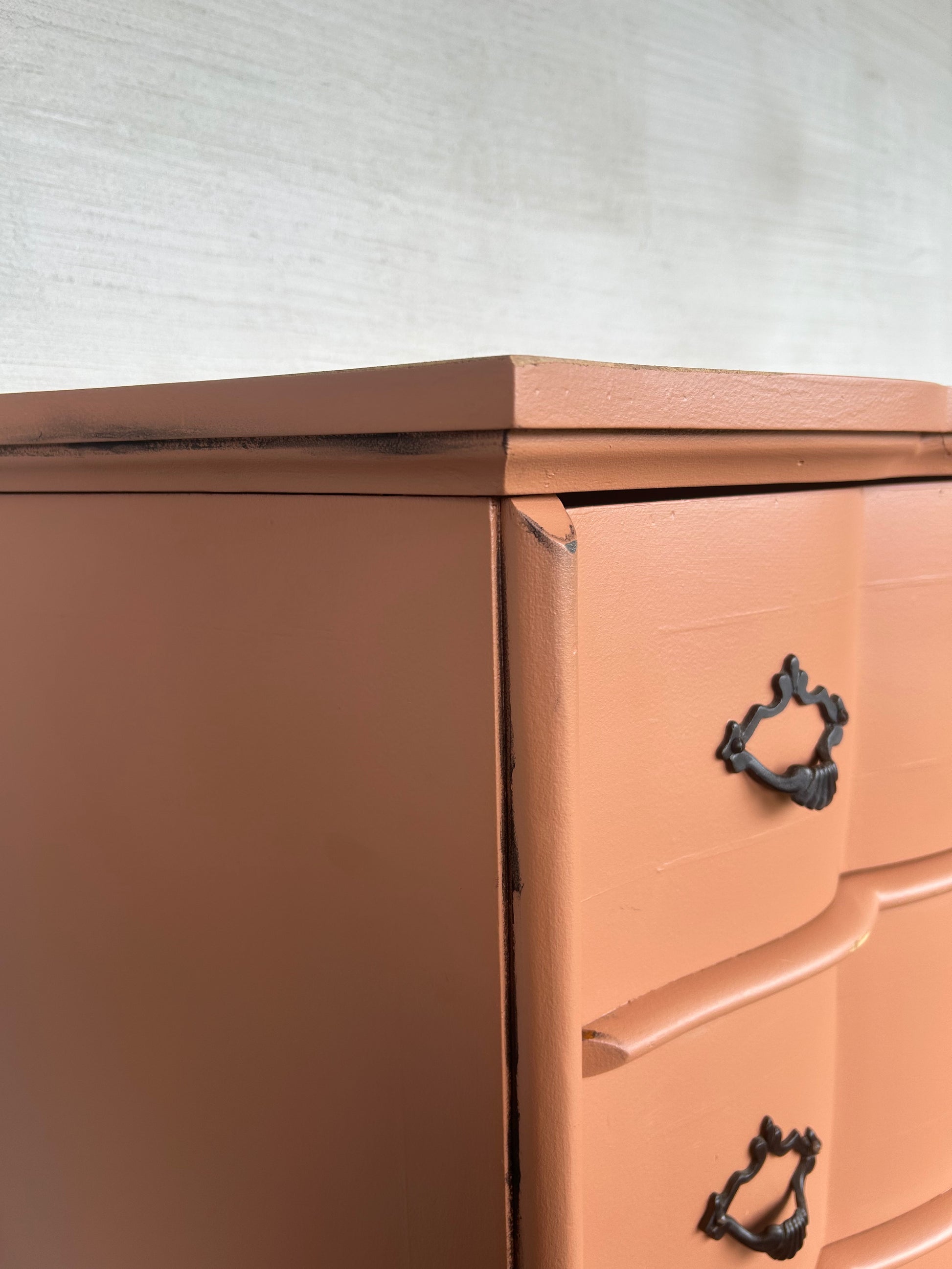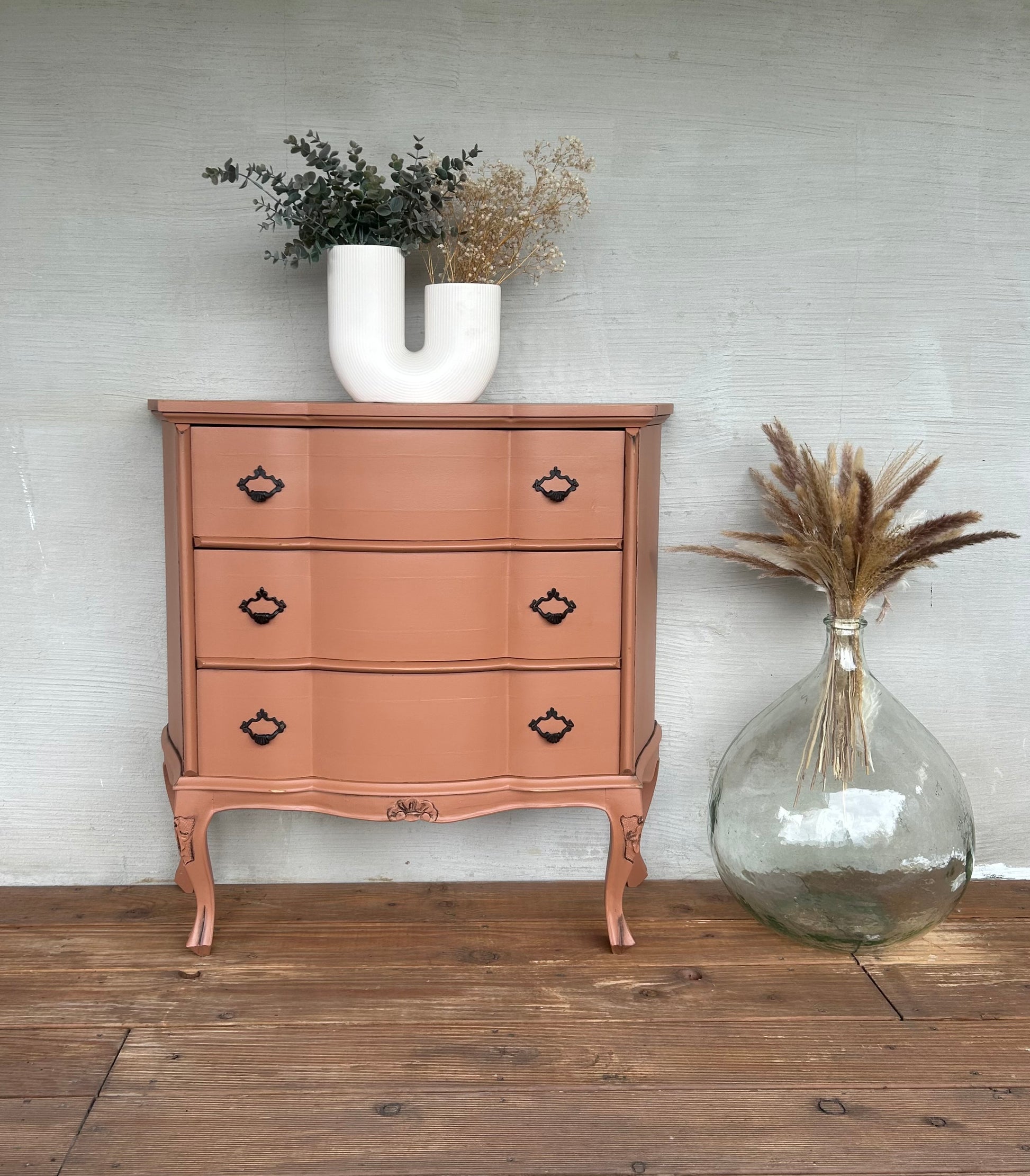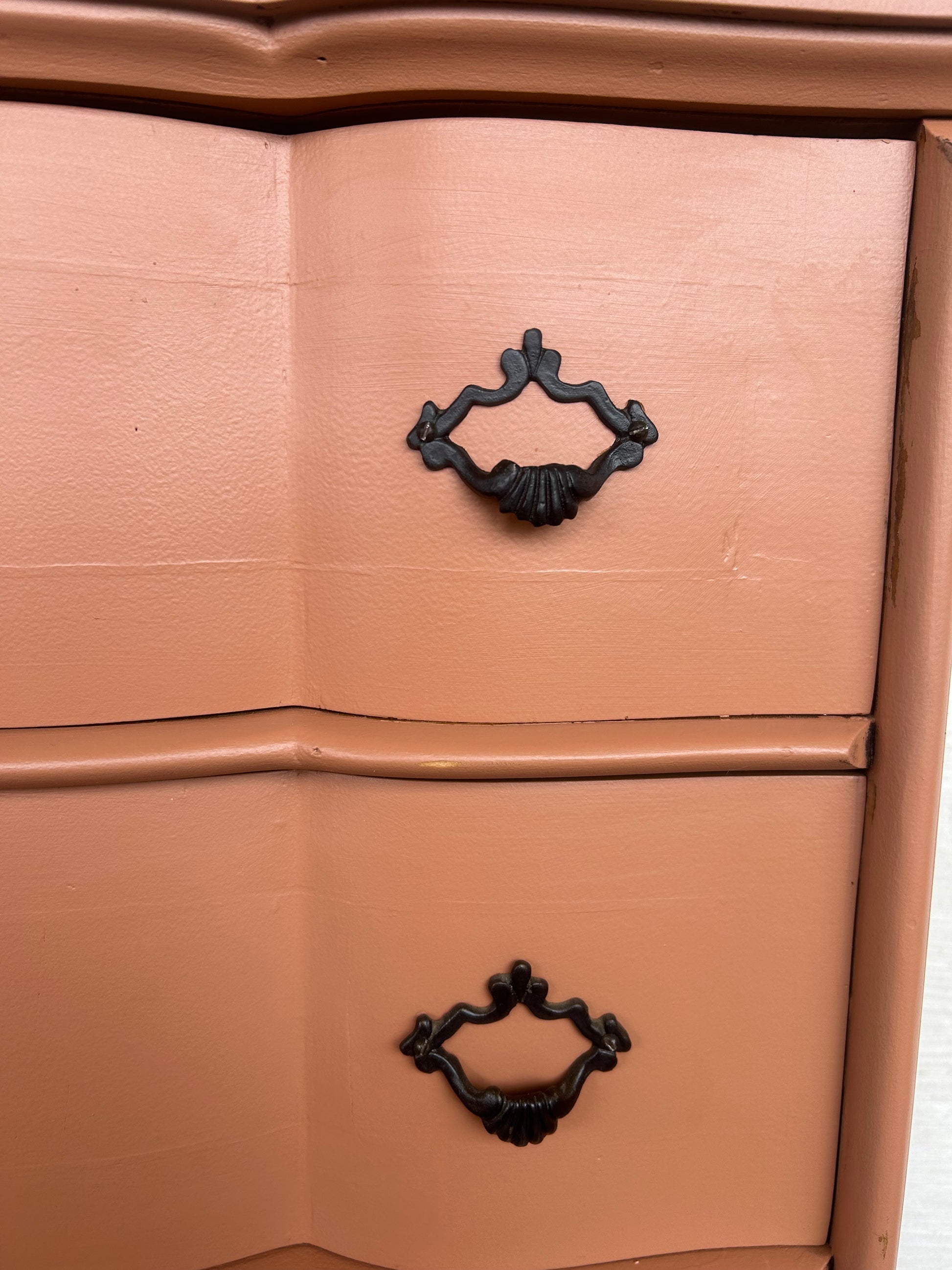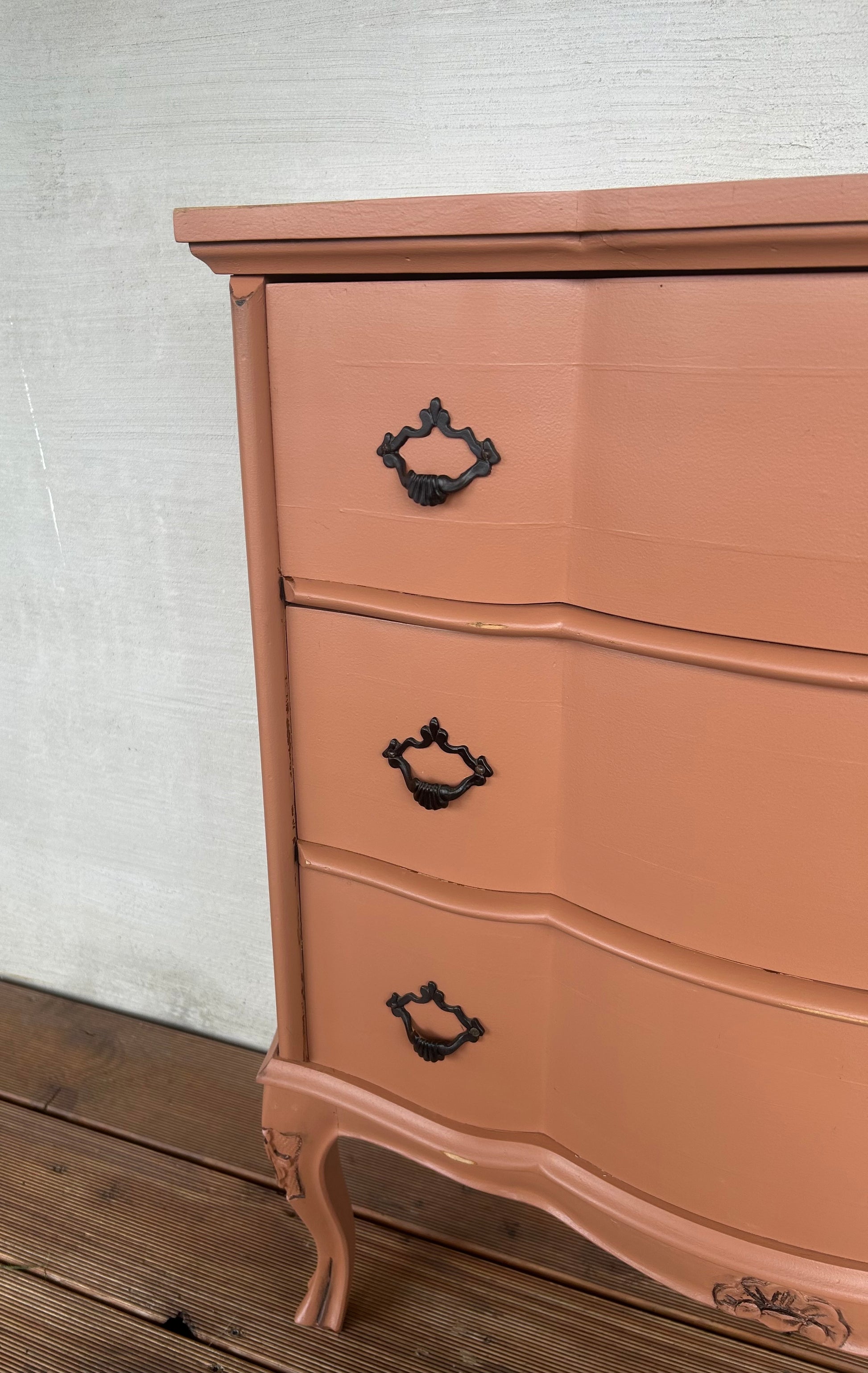 Diese liebevoll aufgearbeitete Brocante-Kommode bringt französischen Landhauscharme direkt in Ihr Zuhause. In einem zarten Apricotton-Farbton lackiert und mit den originalen, neu in Schwarz lackierten Griffen versehen, vereint sie nostalgische Eleganz mit charaktervollem Vintage-Flair.