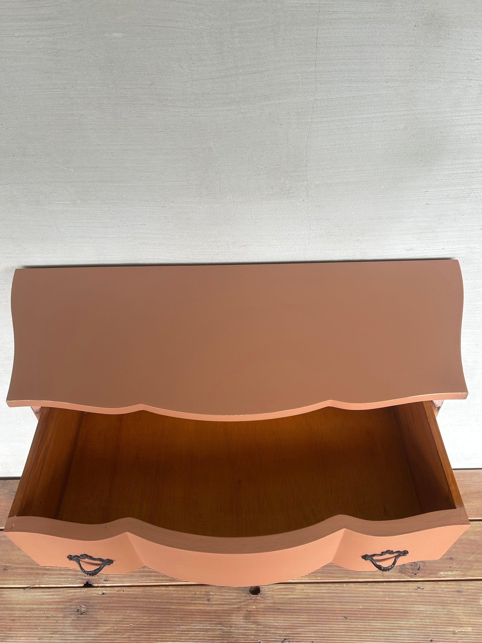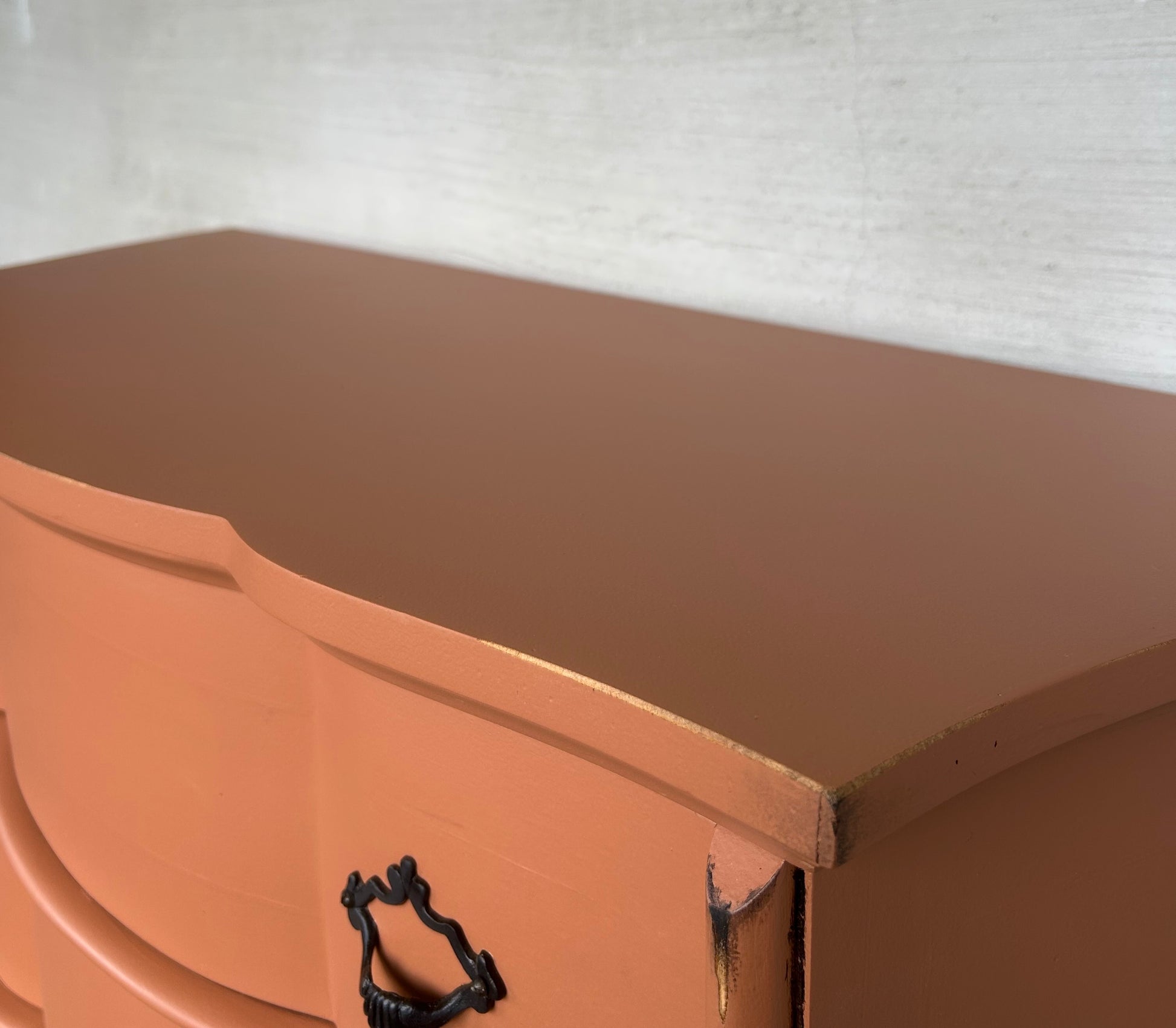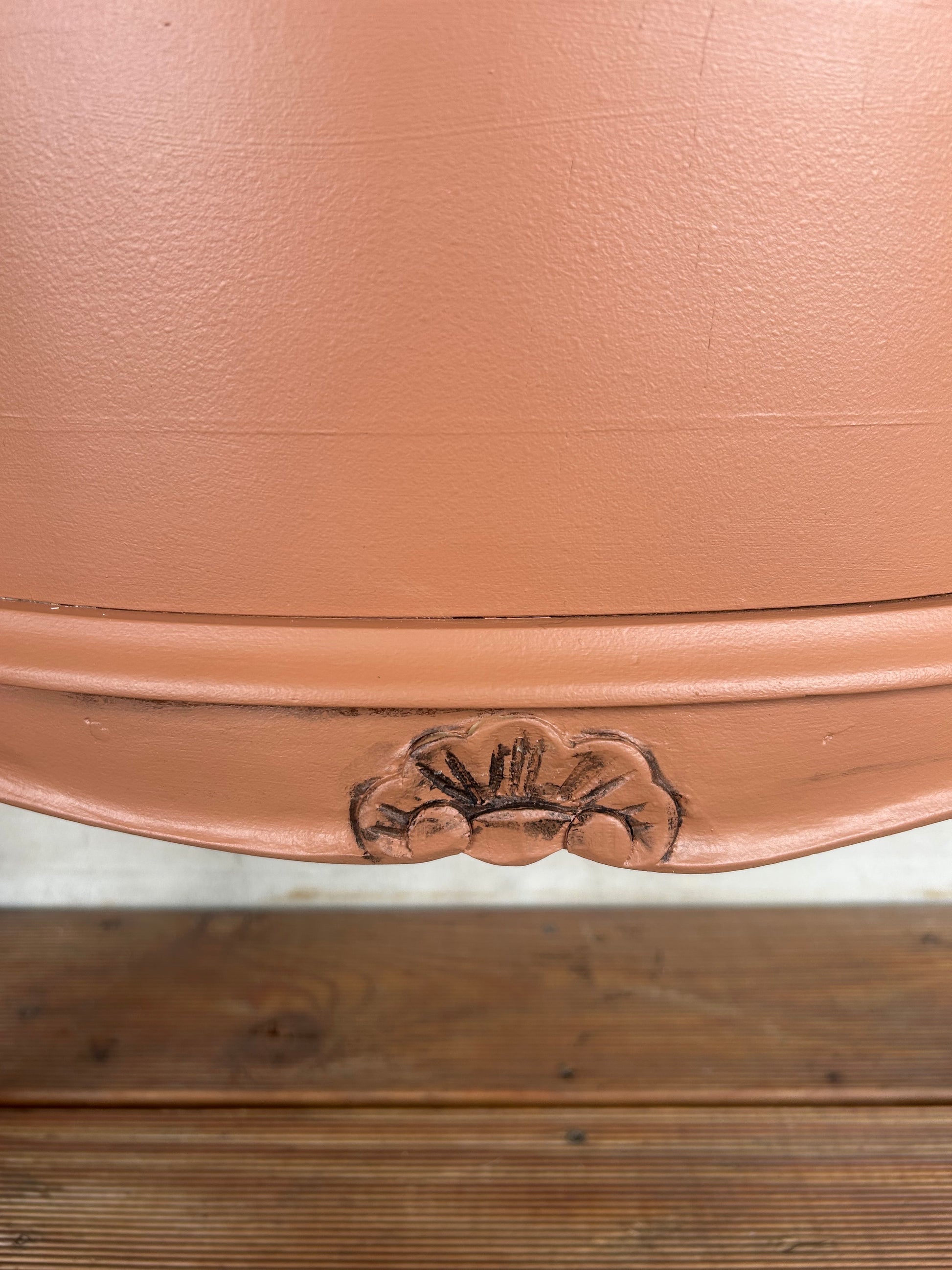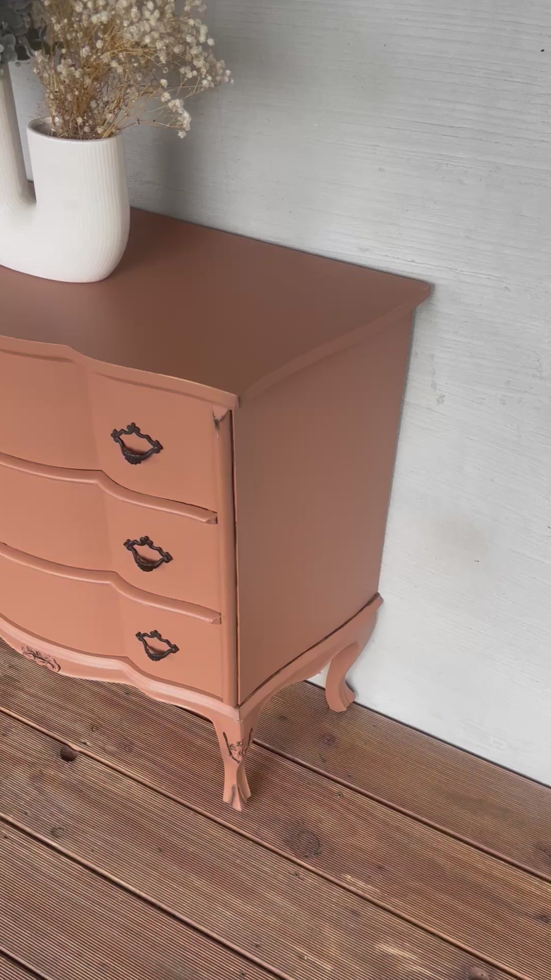 Diese liebevoll aufgearbeitete Brocante-Kommode bringt französischen Landhauscharme direkt in Ihr Zuhause. In einem zarten Apricotton-Farbton lackiert und mit den originalen, neu in Schwarz lackierten Griffen versehen, vereint sie nostalgische Eleganz mit charaktervollem Vintage-Flair.