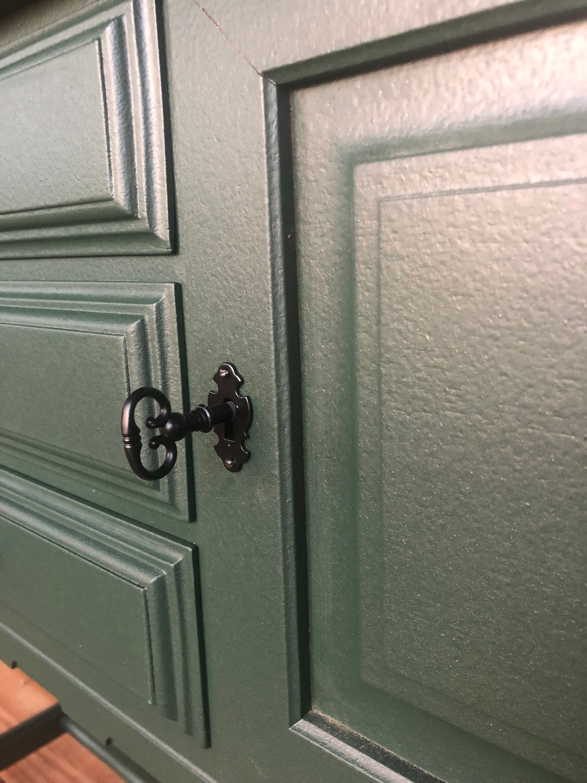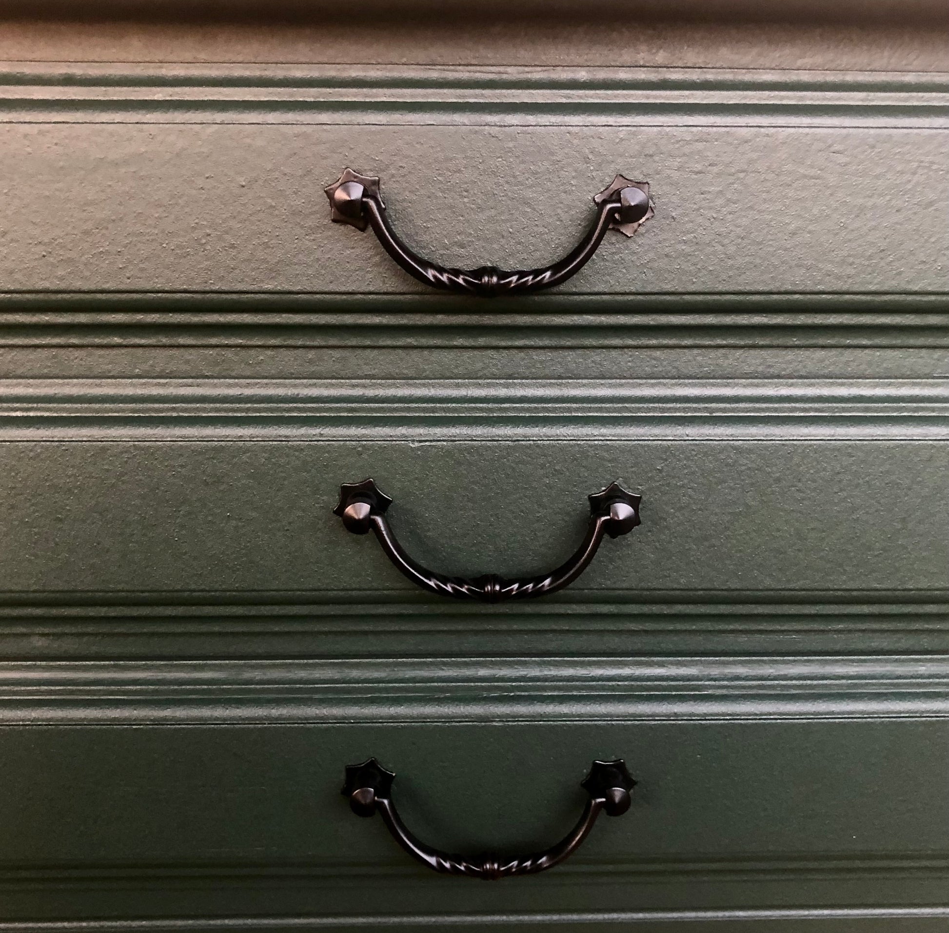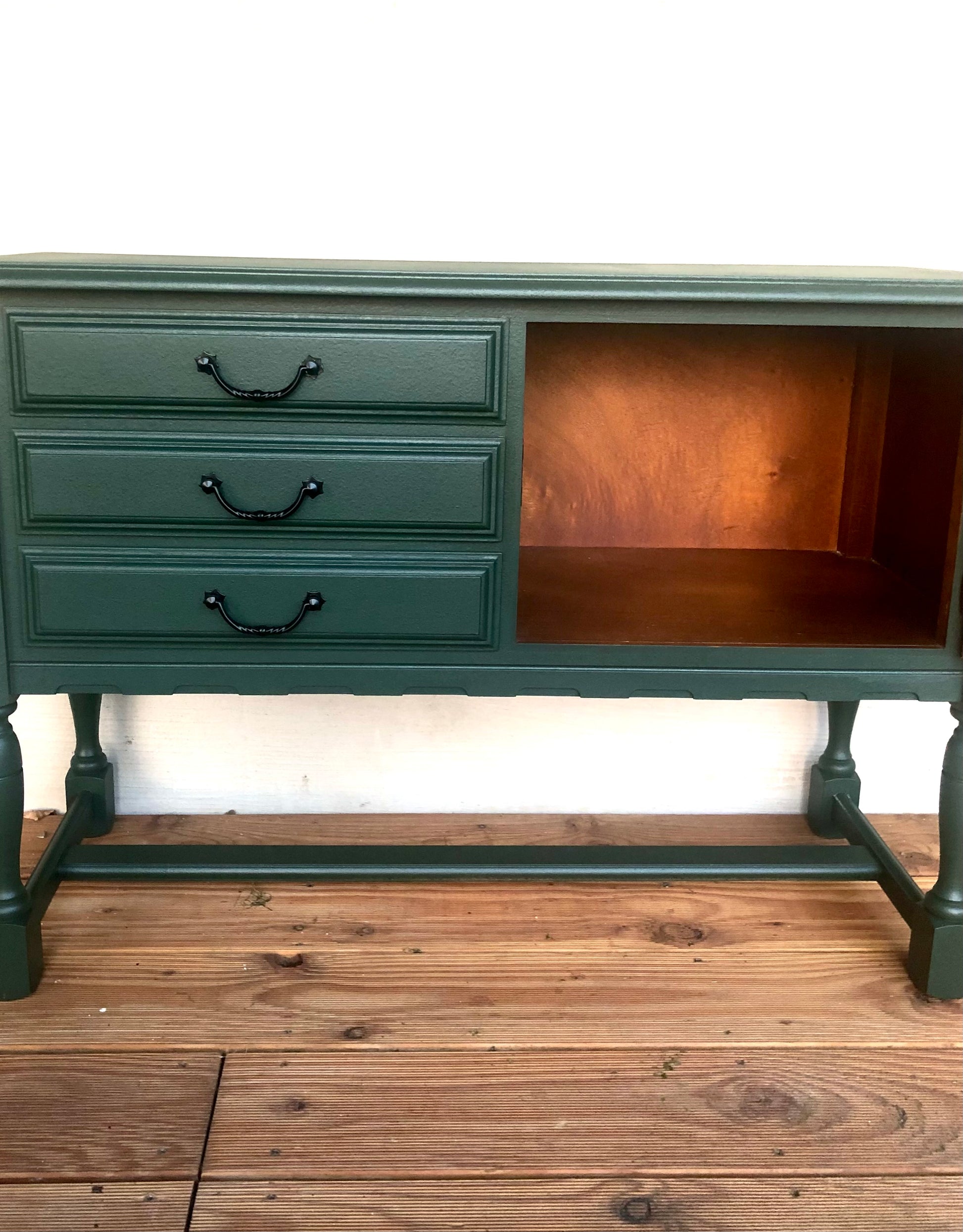 Diese elegante Kommode wurde liebevoll und fachgerecht neu gestaltet. Der Korpus ist mit hochwertiger, langlebiger Acrylfarbe in einem edlen Dunkelgrün gestrichen, das jedem Raum eine warme und stilvolle Note verleiht.