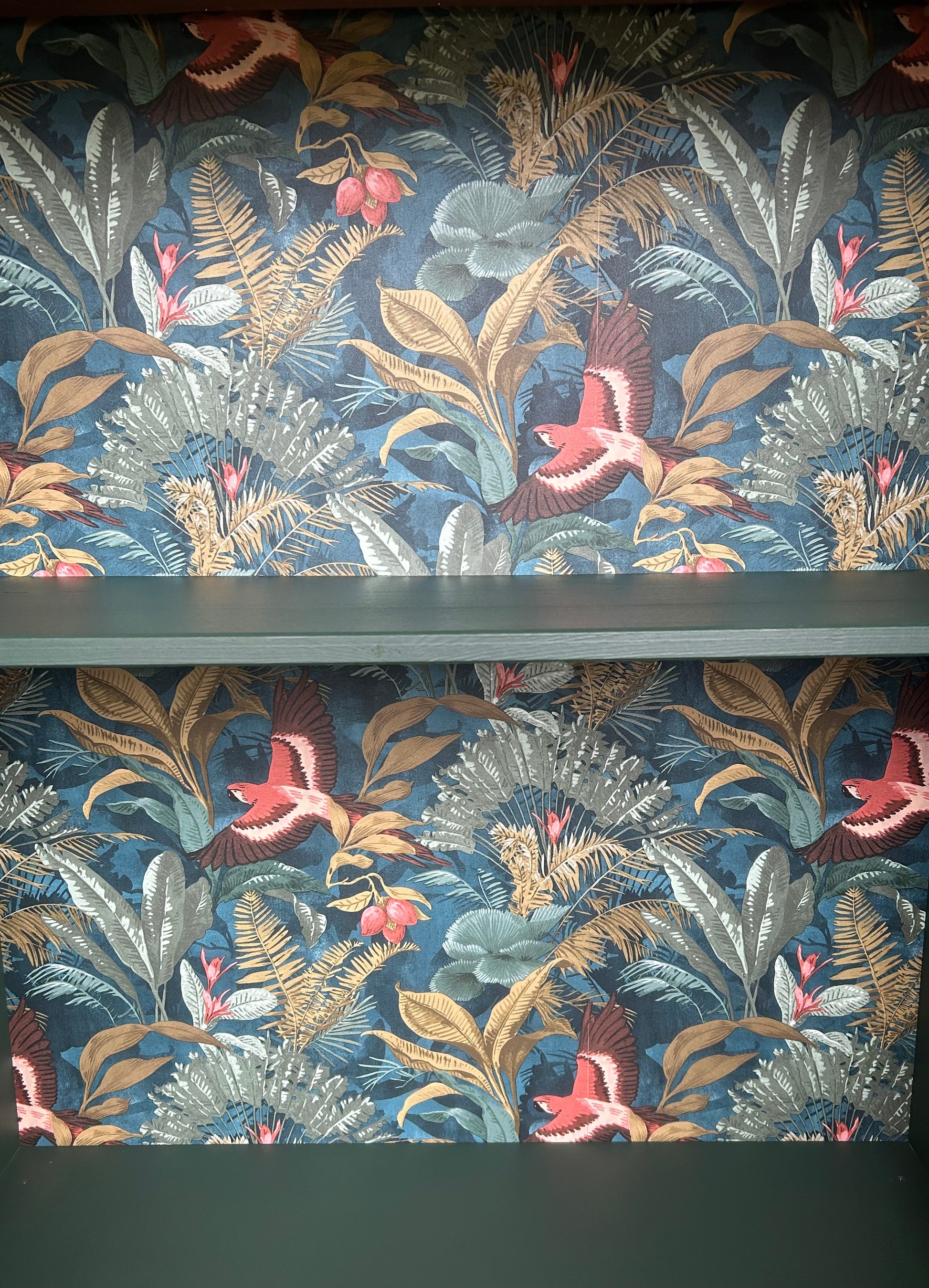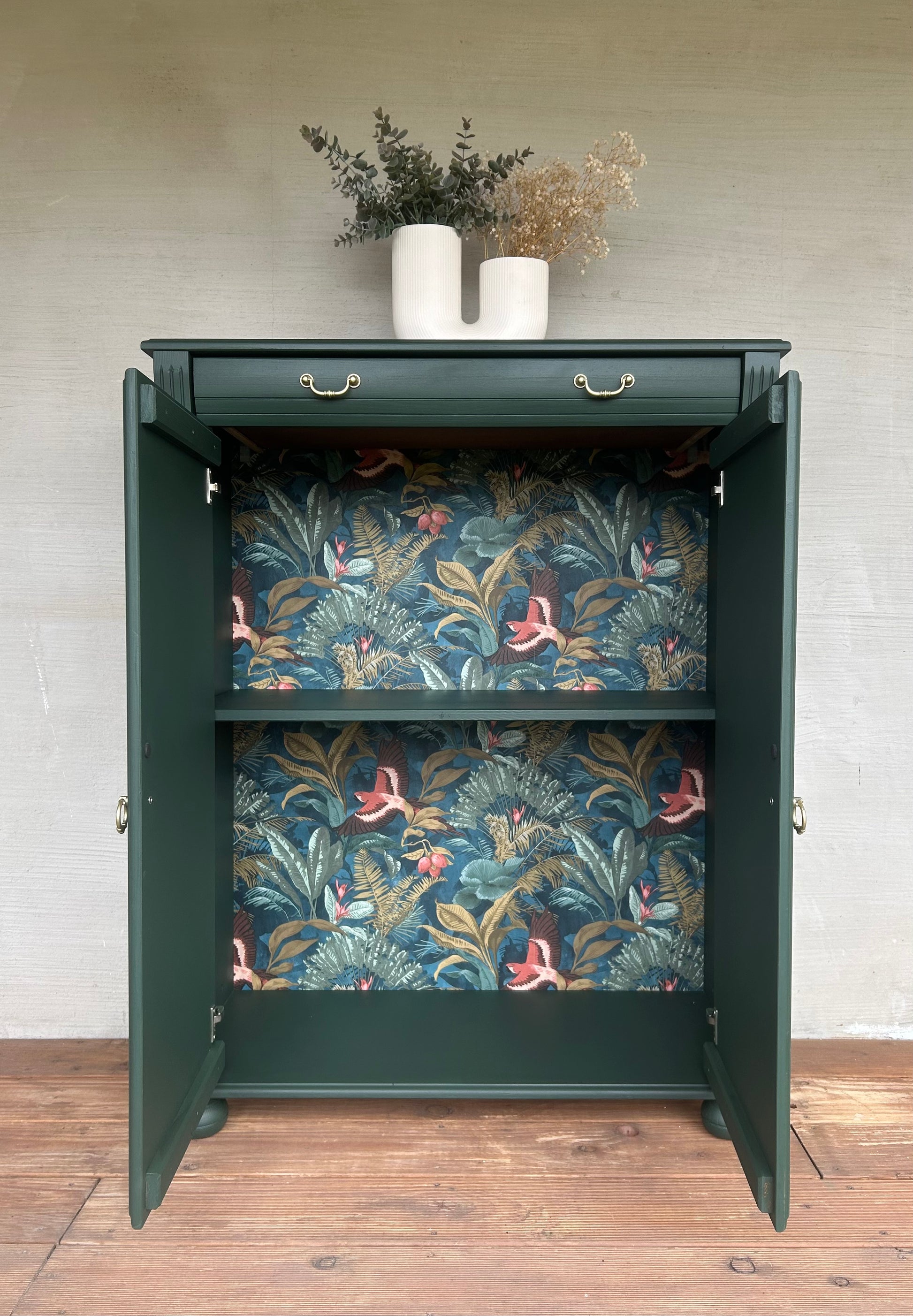 Dieser dunkelgrüne Vertiko ist mehr als nur ein Möbelstück – er ist ein Statement. Aus hochwertigem Massivholz gefertigt, vereint er edle Materialien und cooles Design. Die goldenen Beschläge verleihen ihm einen luxuriösen Touch, während die zwei Türen und die Schublade praktischen Stauraum bieten. Doch der wahre Blickfang ist die Rückwand, die mit einer stylischen tropischen Dschungeltapete begeistert und dem Schrank das gewisse Etwas verleiht. Ein wahres Unikat für dein Zuhause – für all diejenigen, die das Besondere lieben
