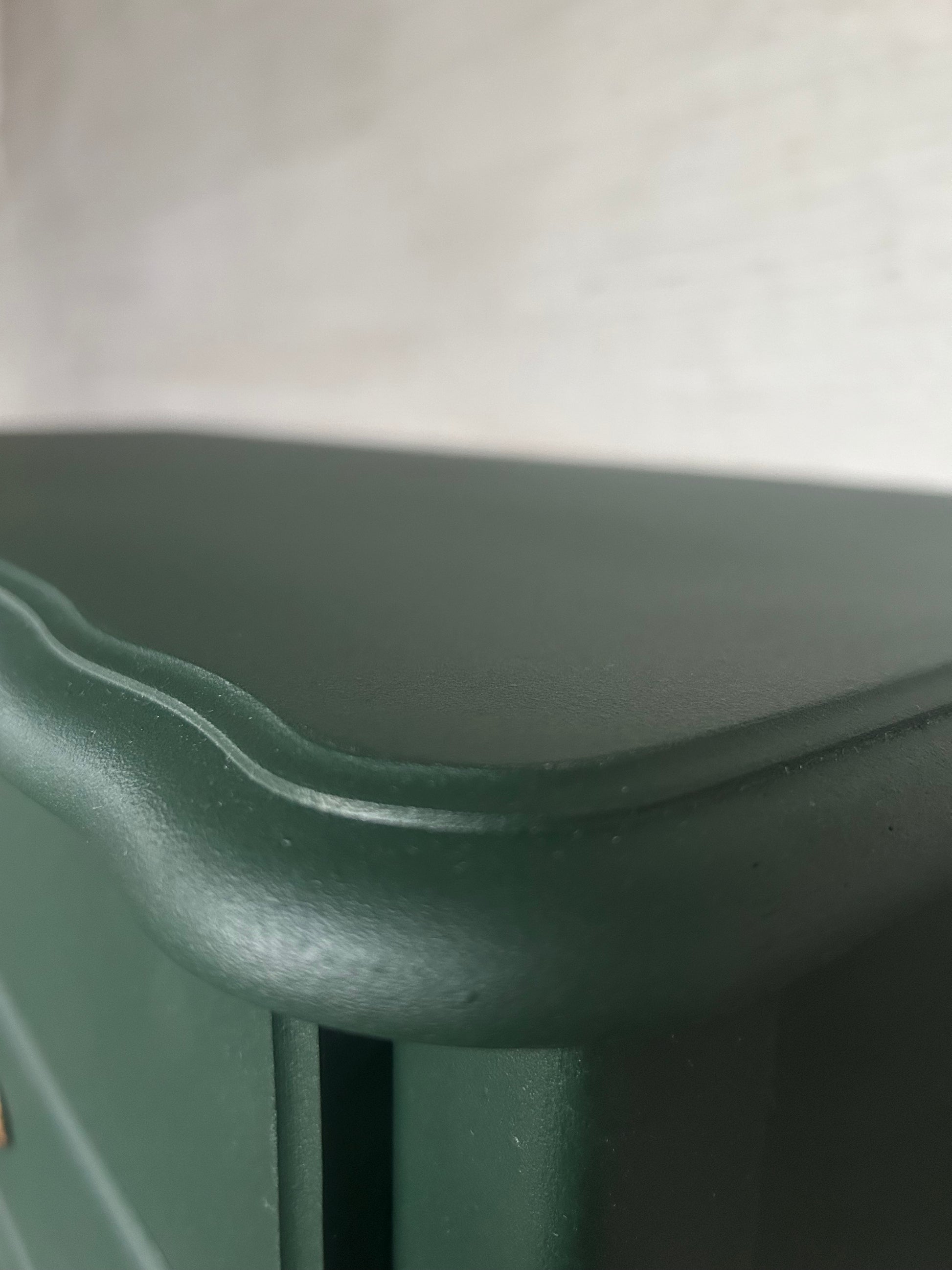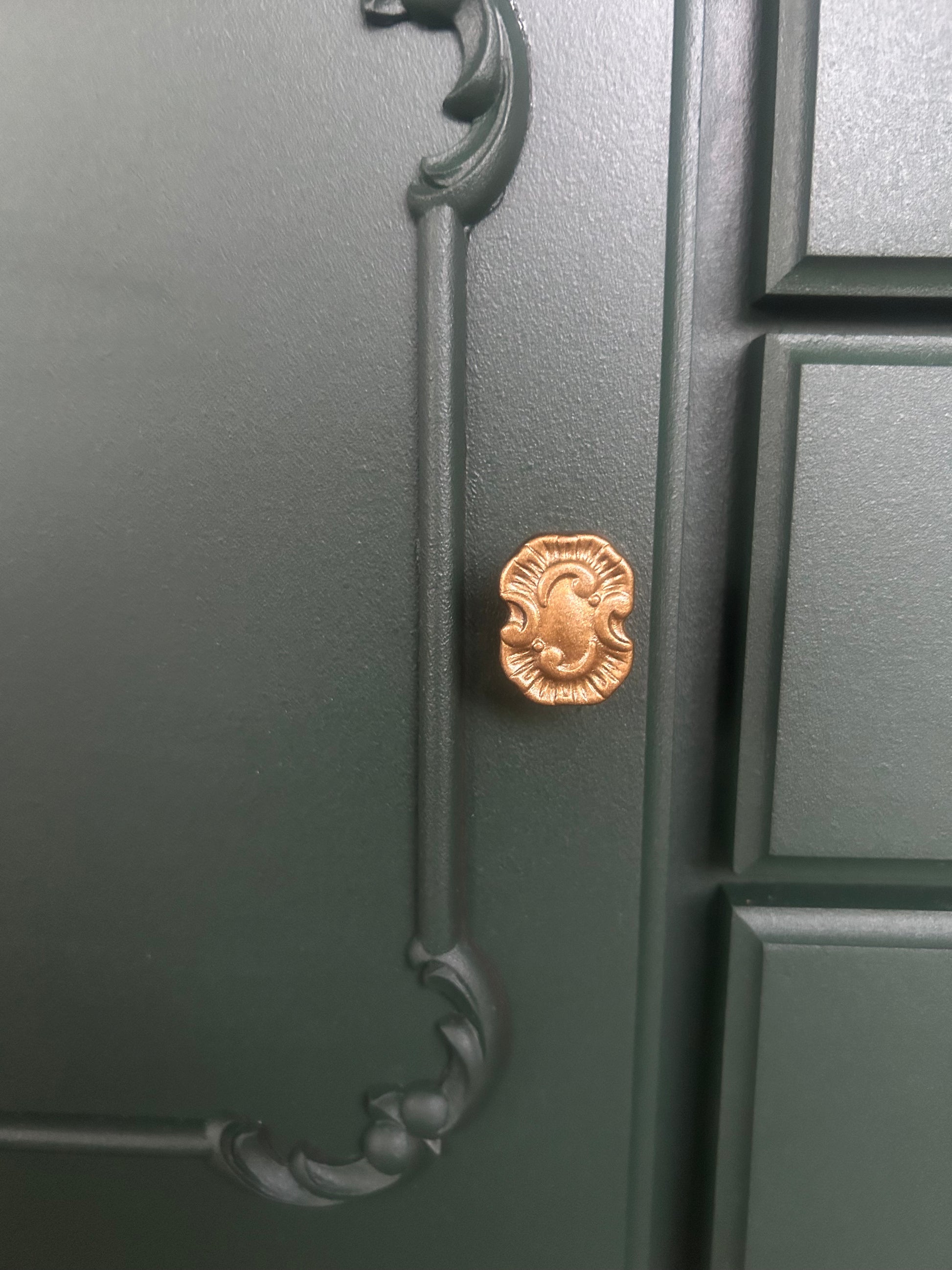 Dieses Sideboard wurde in einem satten Grün gestrichen, das Wärme und Eleganz in jeden Raum bringt. Die originalen Beschläge, Scharniere und der Türknopf wurden in Gold veredelt und setzen edle Akzente.