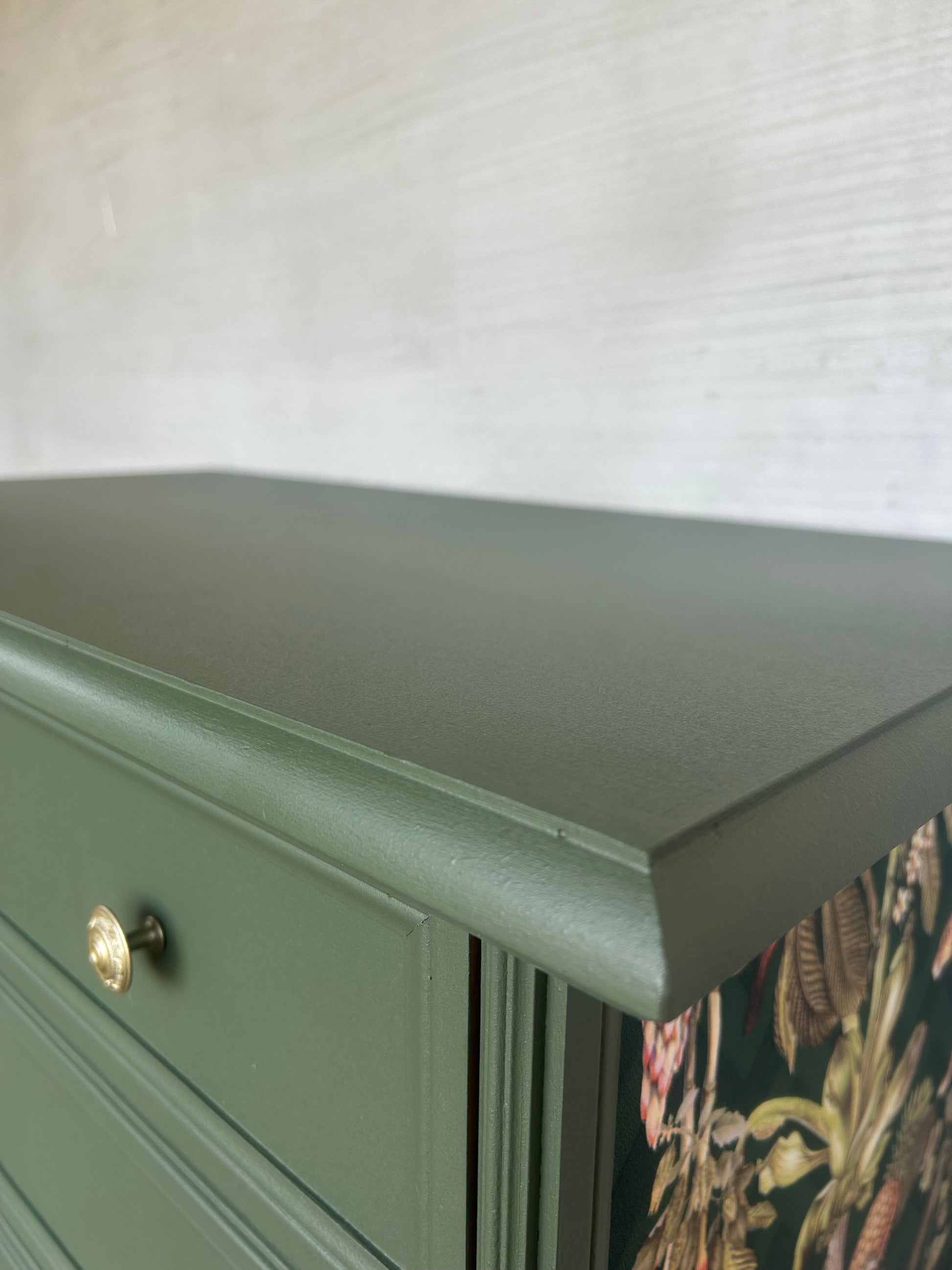 Diese Kommode ist ein stilvolles Vintage-Unikat mit Charakter. Lackiert in einem satten Olivgrün (hochwertige Acrylfarbe, seidenmattes Finish) und mit viel Liebe zum Detail überarbeitet, zieht sie garantiert die Blicke auf sich. Die vier Schubladen wurden im Originalzustand belassen – das Innenleben samt Einlegeböden wurde sorgfältig gereinigt und aufpoliert. Die Original Griffe wurden lackiert und neue, filigrane Metallfüße in passendem Goldton setzen elegante Akzente und verleihen dem Möbelstück eine zeitlose Ausstrahlung.