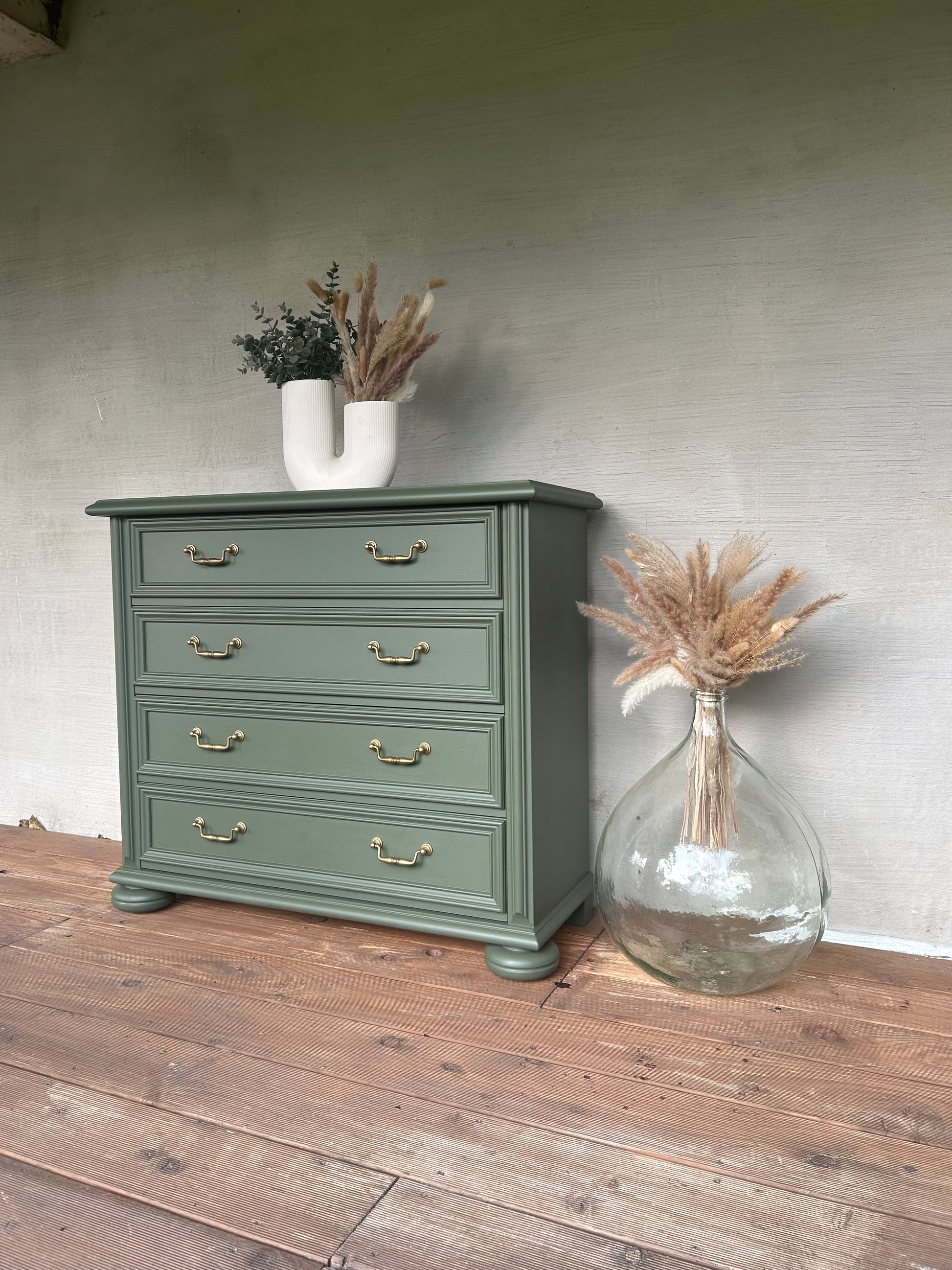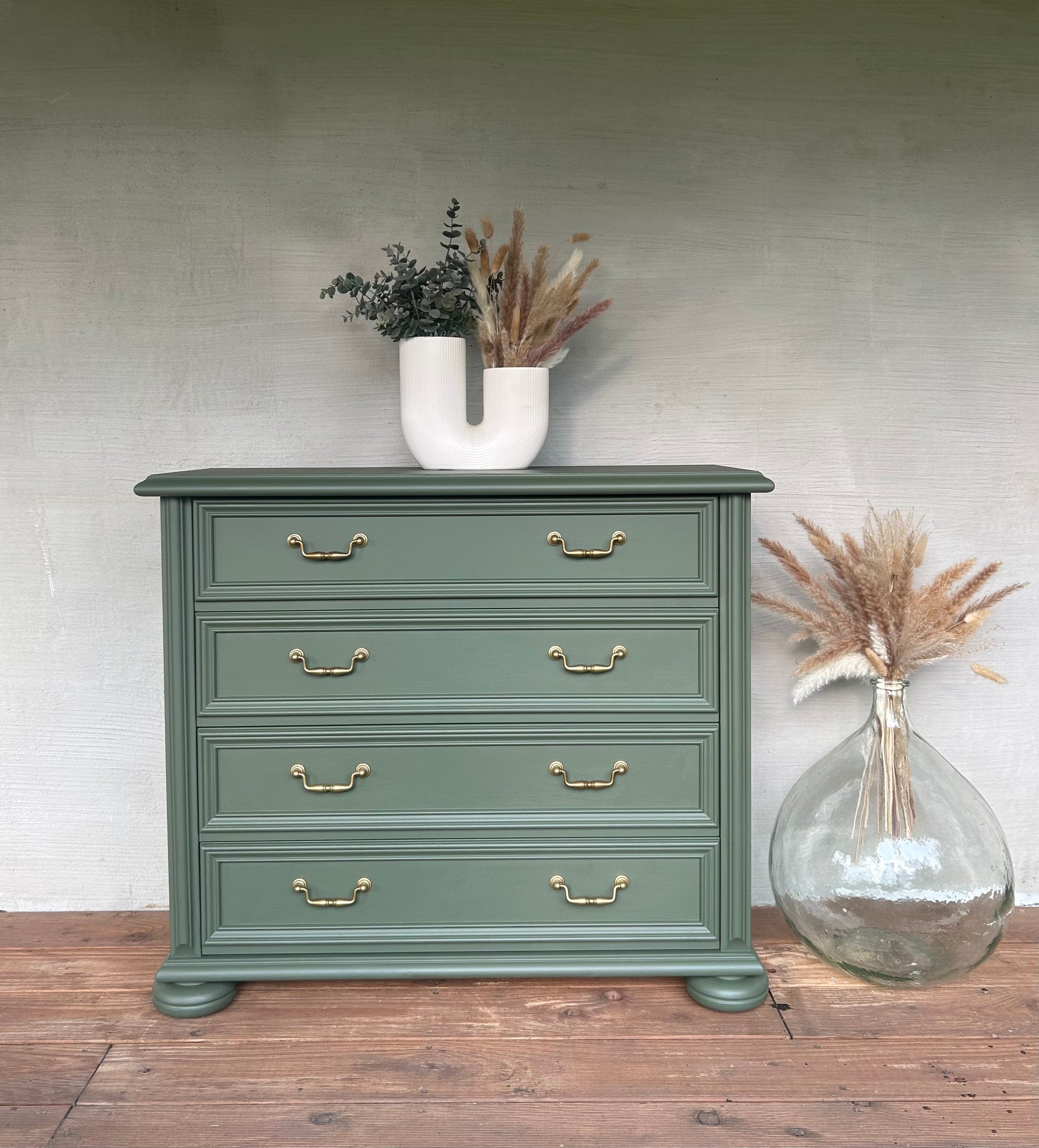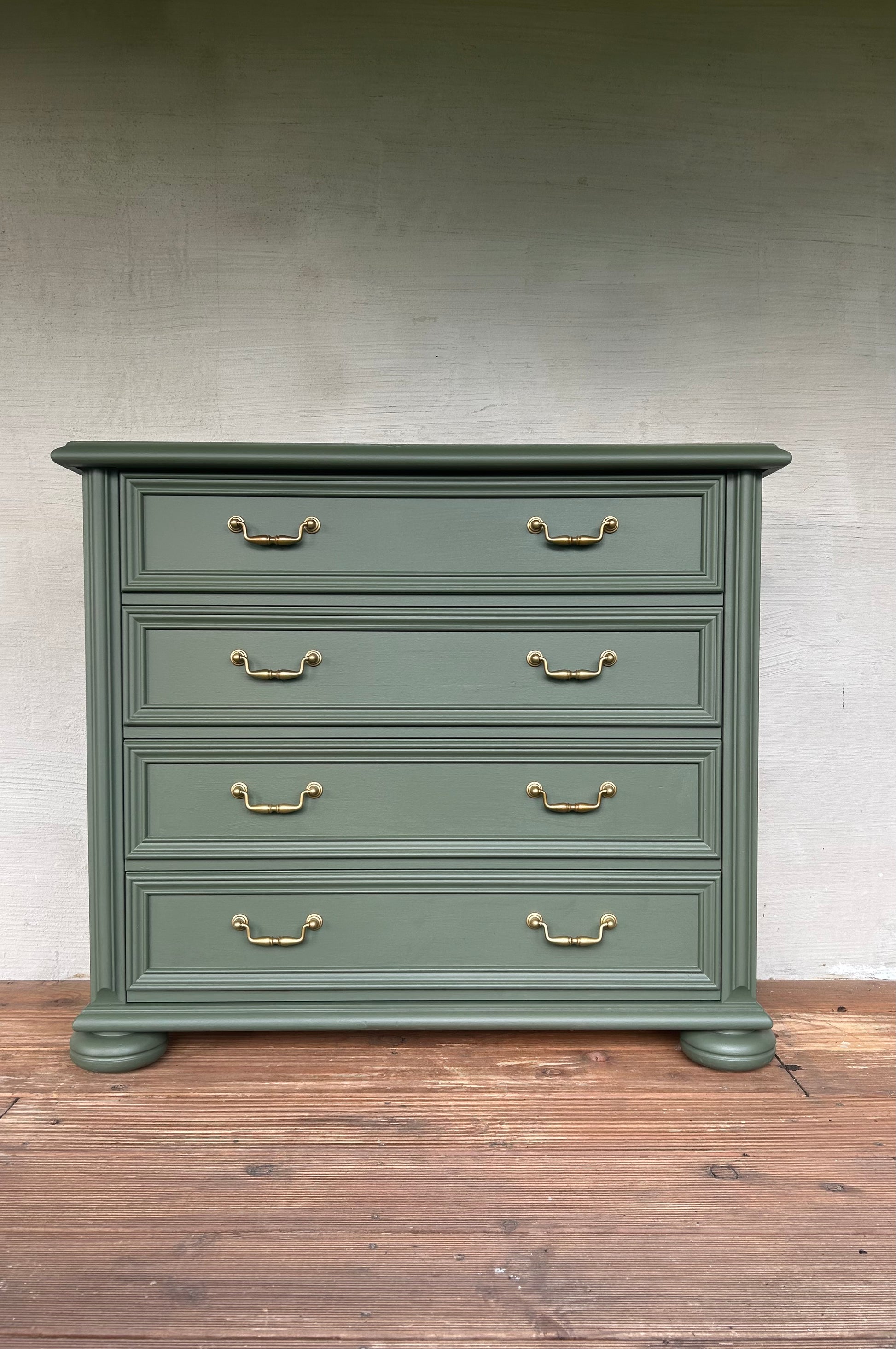 Die Oberfläche wurde sorgfältig mit hochwertiger, widerstandsfähiger Acrylfarbe im stilvollen Farbton Olivgrün gestrichen. Die vier großzügigen Schubladen gleiten leicht und bieten reichlich Stauraum – ideal für Kleidung, Unterlagen oder Alltagsgegenstände. Die Einlegeflächen im Inneren wurden gründlich gereinigt und aufpoliert, sodass sie sofort einsatzbereit sind.