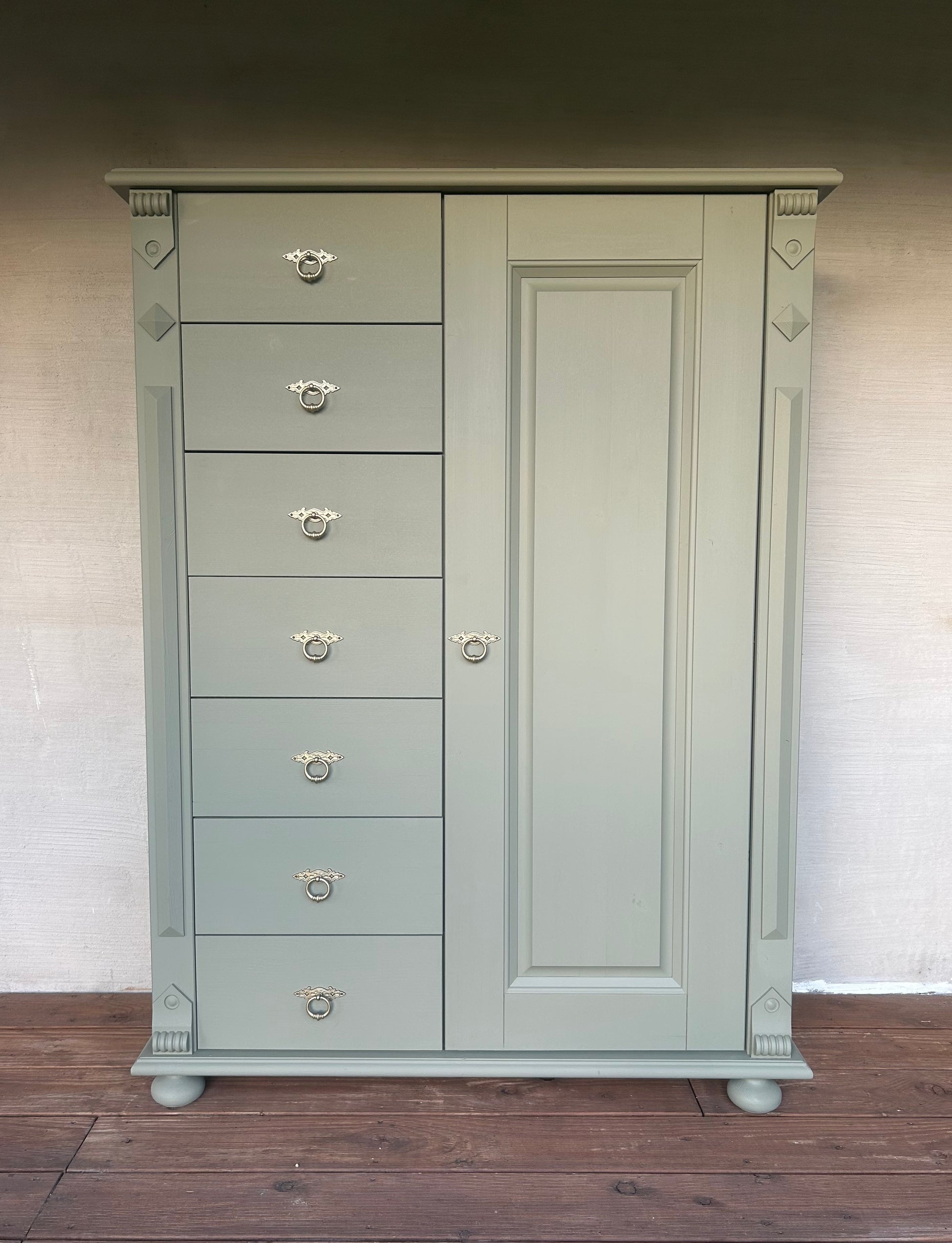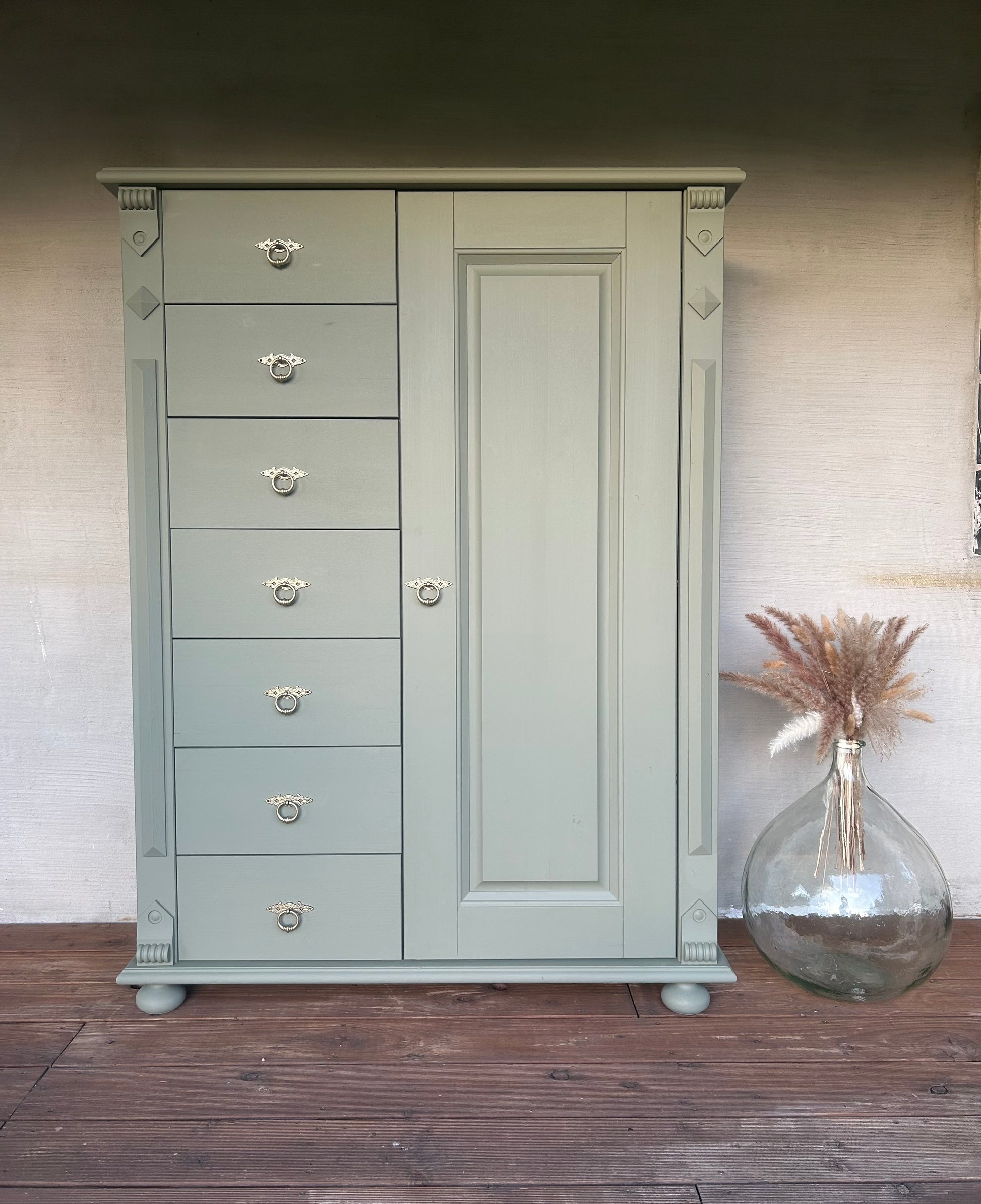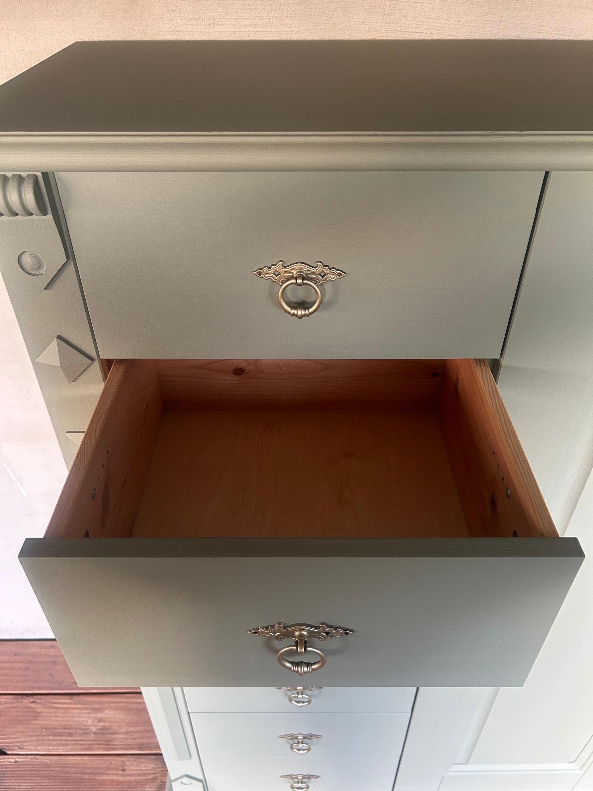 Dieses besondere Möbelstück vereint klassisches Design mit frischer Eleganz. Die hochwertige Kommode wurde in liebevoller Handarbeit neu interpretiert und in einem sanften Salbeigrün lackiert – ein Farbton, der Ruhe ausstrahlt und sich wunderbar in moderne wie auch vintage-inspirierte Räume einfügt.
