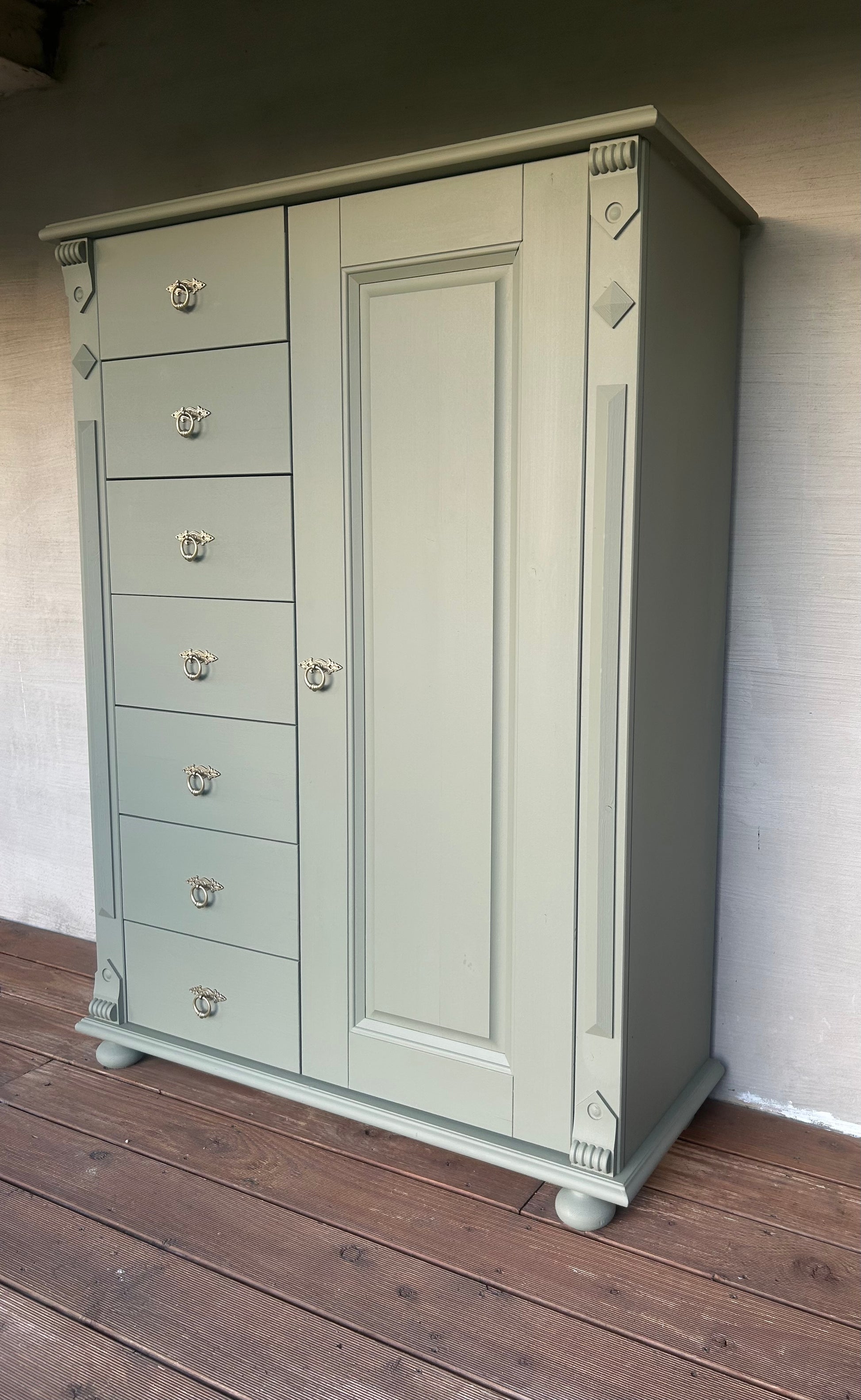 Die linke Seite bietet sieben geräumige Schubladen mit feinen Metallgriffen im Antikstil, während die rechte Tür drei großzügige Fächer verbirgt – ideal für Kleidung, Bücher oder besondere Schätze.