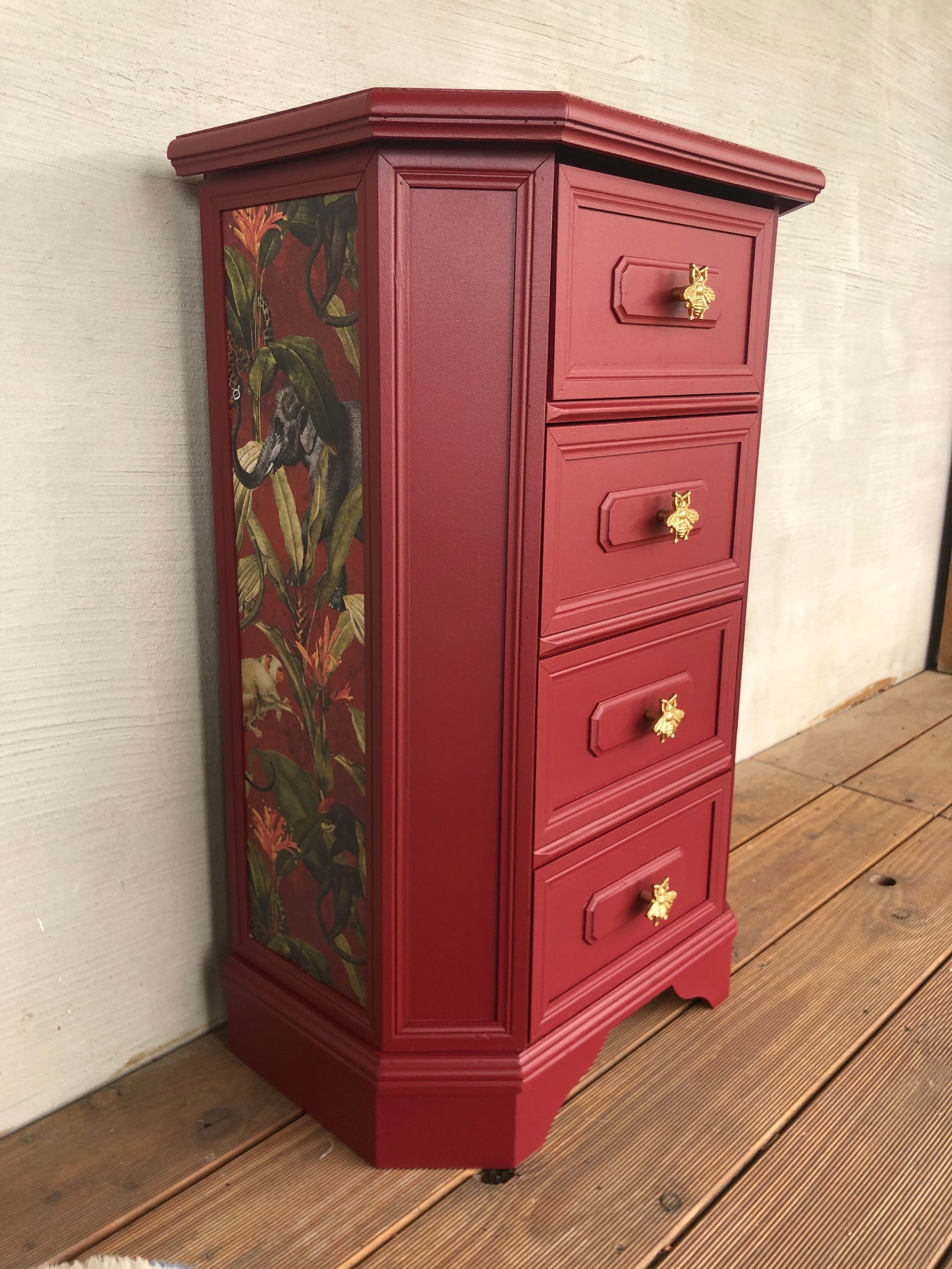 Bist du auf der Suche nach einem echten Unikat für dein Zuhause? Dann ist diese geupcycelte Vintage-Kommode im gemütlichen Landhausstil genau das Richtige für dich! Dieser kleine rote Schubladenschrank mit goldfarbenen Griffen und stylischer Tapete an den Seiten ist ein echter Blickfang und ein optisches Highlight, das sofort zum Gesprächsthema wird. Ob für dein Wohnzimmer, Schlafzimmer, den Eingangsbereich oder den begehbaren Kleiderschrank; mit diesem eleganten Einzelstück schaffst du eine klassische und einzigartige Atmosphäre, die du und deine Gäste garantiert lieben werdet. Also, worauf wartest du noch? Hol sie dir jetzt!